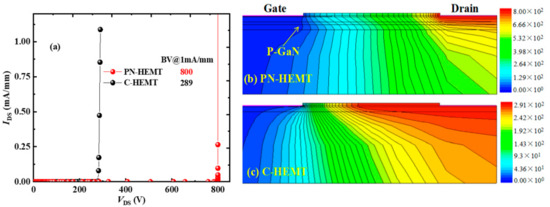 Figure 4a compares the I−V characteristics of the PN-HEMT and C-HEMT. The breakdown voltage (BV) is extracted from the IDS−VDS curve when IDS = 1 mA/mm. Compared to the BV of 289 V in the C-HEMT, a higher BV of 800 V is achieved by the proposed PN-HEMT. Figure 4b,c show the distribution of equipotential lines for the PN-HEMT and C-HEMT at breakdown. As shown in Figure 4b, the equipotential lines are more uniformly distributed between the gate and drain owing to the redistribution of the electric field of the P−GaN buried layer [35,36]. However, the equipotential lines for the C-HEMT are more crowded near the gate. Additionally, the buffer leakage current is reduced by the P−GaN buried layer, further increasing the BV. Consequently, the PN-HEMT achieves a higher BV.