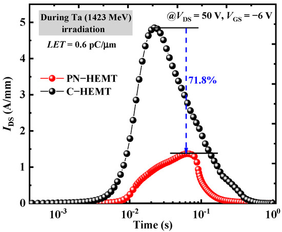 The variations in IDS over time for the PN-HEMT and C-HEMT after a particle strike at VDS = 50 V and VGS = −6 V (off state) are shown in Figure 5. After the particle strike, the IDS for both devices initially increase rapidly and reach their peaks (Ipeak), then quickly decrease. The Ipeak of the PN-HEMT (1.37 A/mm) is 71.8% lower than that of the C-HEMT (4.85 A/mm). Additionally, the drain current pulse duration of the PN-HEMT is shorter than that of the C-HEMT. Therefore, the PN-HEMT demonstrates a much better resistance to the SET effect compared to the C-HEMT.