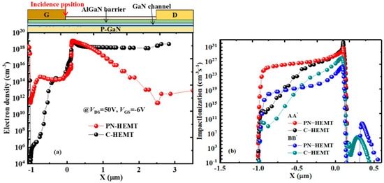 To explain the lower Ipeak for the PN-HEMT, the electron density in the channel (BB’) for the PN-HEMT and C-HEMT at peak time is analyzed, as shown in Figure 6a. It can be seen that, due to the P-GaN buried layer depleting electrons in the channel between the gate and drain in the PN-HEMT, there is a noticeable reduction in electron density. In addition, the effect on electron concentration from the locally doped barrier layer under the gate is minimal. However, the electron density remains high in the C-HEMT. To further elucidate the low electron concentration in the PN-HEMT, the impact ionization rate (IR) for the PN-HEMT and C-HEMT at peak time is analyzed, as shown in Figure 6b. The results show that the IR at the AlGaN barrier (AA’) and GaN channel (BB’) interface for the PN-HEMT is smaller than that of the C-HEMT. This is mainly due to the lower electric field along the particle incident path in the PN-HEMT, as shown in Figure 7, which suppresses electron–hole pair ionization. Hence, fewer electrons are generated in the PN-HEMT at peak time, resulting in a significantly lower Ipeak.