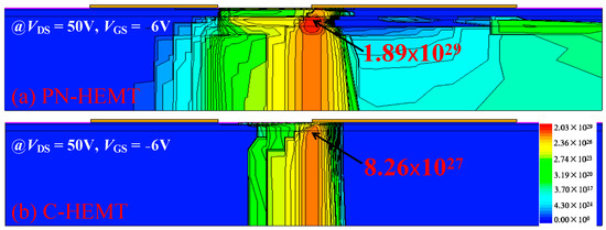 SRH recombination rate at peak time for (a) PN-HEMT and (b) C-HEMT.