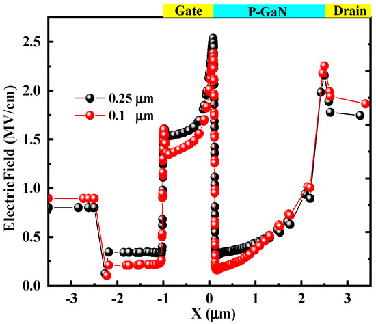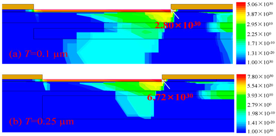 The influences of D and NP on the Ipeak of the PN-HEMT at T = 0.05 μm are shown in Figure 9a. The results indicate that the Ipeak of the PN-HEMT decreases to a minimum and then increases again with the increase in D and NP. Figure 9b shows the effects of T on the Ipeak. As T increases, the Ipeak initially decreases and then increases. This is mainly due to the higher electric field that is obtained with the thicker T, as shown in Figure 10. Changes in the electric field in the device have an important effect on the IR. Therefore, the IR is higher for the thicker T, as shown in Figure 11, and therefore more electron–hole pairs will be generated at a thicker T, resulting in a higher Ipeak. When NP is 7 × 1017 cm−3, T is 0.1 μm, and D is 0.05 μm, the Ipeak of the PN-HEMT reaches its lowest value (1.37 A/mm). Simultaneously, ID,sat and BV are increased by 21.2% and 63.9%, respectively. Therefore, the PN-HEMT enhances the device’s resistance to SET effects without sacrificing other key characteristics of the GaN HEMT.