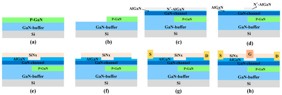 Figure 12 illustrates the key feasible fabrication process flows for the PN-HEMT. The steps start with epitaxially growing GaN buffer and P-GaN layers on a Si substrate by MOCVD in Figure 12a. The realization of an epitaxial P-GaN layer could be achieved by using Mg as dopant. The P-GaN layer is selectively etched by ICP until the GaN buffer is exposed, as shown in Figure 12b, and, then, surface treatment is used to improve the surface quality [37]. The GaN buffer/GaN channel/AlGaN/N+-AlGaN are regrown by MOCVD, as shown in Figure 12c [38]. The ICP is utilized to selectively etch N+-AlGaN until the AlGaN layer is exposed, as shown in Figure 12d, which is followed by surface treatment. Subsequently, the regrowth of the AlGaN layer is achieved by MOCVD and a SiNx passivation layer is formed by LPCVD, as shown in Figure 12e. Afterwards, digital etching is used to form the source and drain trenches, as shown in Figure 12f. The Ti/Al/Ni/Au stack is deposited with a low-temperature Ohmic process and lift-off for source and drain electrode are performed, as shown in Figure 12g. Finally, the gate electrode is formed by e-beam evaporation after selectively removing SiNx by RIE, and is then lifted off, as shown in Figure 12h.
