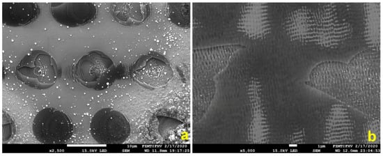 Figure 3a shows that the LSFL-II-type structure did not convert into a new LIPSS type after 4 accumulated scans, but the LIPSS shape is slightly more distinct. In Figure 3b, the scan direction and polarization were reversed for all 4 scans; one can clearly see that the orientation of the LSFL-II structure is accordingly following the new laser polarization in agreement with [7]. Unfortunately, electrical measurements indicated that the thermal oxide had poor insulation quality. We assume that locally generated spongy structures with low ohmic resistivity and low electrical breakdown voltage are caused by ablation debris sintered onto the surface (Figure 4a; area inside the red circle on top of the thermal oxide). It is possible that an additional cause for the low resistivity is related to pre-surface-triggered nanoplasma explosions in the laser ablation process [16]. This might create nanobubble defects in the bulk close to the surface of LIPSS. After thermal oxidation, these nanobubbles are inside the thin insulation oxide layer causing a significantly reduced breakdown voltage. Figure 5 indicates that our second conclusion for the reduced breakdown voltage has a good possibility to be a real route cause. We used the same laser parameter as in the previous experiment, only the laser power was reduced to measured 329 mW. After one scan, the LIPSS formation just started, predominately at locations with particles causing a coherent field enhancement and facilitating LIPSS formation in their vicinity (Figure 5a, white sphere in the center, 1 µm in diameter). At a radial distance of about 3 to 4 µm, the ablation started pointwise (white arrows) and one gains the impression that LIPSS formation started just “under the skin” in a faint pattern of slightly darker parallel lines perpendicular to the laser polarization. According to [16], the surface ripple formation starts (state 1) with a subsurface nonlinear ionization of local defects, continues (state 2) with a periodic plasma sheet formation and finally ends (state 3) with breakdown and ablation of the surface. After 10 consecutive scans, state 3 is reached for nearly most of the ripples, but the process of distinct LIPSS formation is not yet finished. Still, very thin sheets of material (like peeling off sunburnt skin) are visible from the start of state 3 (Figure 5b). We believe this is a further indication that laser ablation and the LIPSS formation mechanism suffer from intrinsic issues for thin thermal oxide isolation fabrication. Figure 4b shows, as a consequence of this, the cross-section of a Si3N4 isolation layer on top of a single LSFL-II ripple for the final demonstrator version of a NiO-based electrical gas sensor [17].