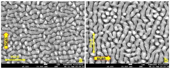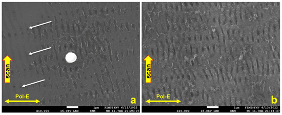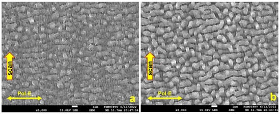 First, the LSFLs orientated parallel to the laser polarization were generated directly on a Si wafer, and in a second step, the oxide layer with a thickness of 350 nm was produced by thermal oxidation on top of the LSFLs. The laser wavelength was 520 nm, the laser pulse frequency was 1000 kHz, the pulse length was 350 fs, the scan speed was 1000 mm/s, the hatch between two scans was 5 µm, the focal length was 170 mm, the focus diameter was in the range of 12 to 14 µm and the measured average laser power was 456 mW. The result after one scan is shown in Figure 2a. LSFL-I-type structures perpendicular to the polarization begin to arise. However, one can already see additional, somewhat irregular structures. In the picture after the second scan (Figure 2b), one can see that the LSFL-I-dominated structures from the first scan, transformed to a great extent into LSFL-II-type structures, oriented parallel to the laser polarization. At any consecutive scan, the previously generated pattern interferes with laser radiation and contributes to metamorphoses toward a new pattern. Also, the number of scans and the laser fluence contribute to that transformation [7].