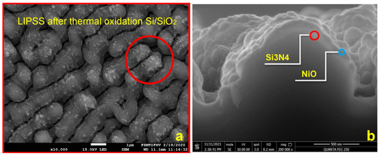 (a) Thermal oxide on LIPSS has poor insulating quality due to sintered debris (inside red circle) from ablation; (b) alternative solution was sputtered Si3N4 layer, red circle in the cross-section.