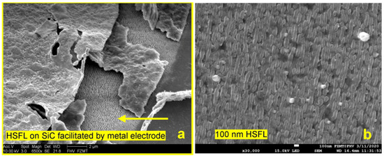 (a) Backside formation of HSFLs between a metal electrode and SiC sample surface due to LIPAA effect indicated by the yellow arrow; (b) 100 nm hatched (depicted by yellow line) HSFLs produced with LIPAA.