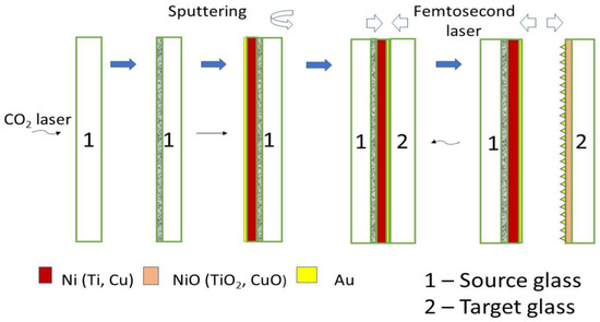 The objective was to fabricate a glass substrate covered with a homogeneous thin NiO/Au or TiO2/Au composite film that was optically sensitive to hydrogen, methane and acetone. The effectiveness shall be tested in an optical gas sensor demonstrator as we proposed in [19]. This method resembles the first step of a LIPAA process. A source for Ni/Au and Ti/Au material is needed and a target is to collect the generated NiO/Au and TiO2/Au nanoparticles generated in the ablation and laser plasma process (see Figure 7). A microscope glass, its surface structured with a CO2 laser to generate micro cracks, was used as the source. After cleaning, the source slide was plasma-coated with 50 nm Ni or Ti and 10 nm Au, respectively. On top of the metal layer, a second microscope glass was placed, which was used as the target to collect the metal oxide nanoparticles. In the final step, the fs-laser light passes through the target glass substrate, ablates the metal coating at the source glass substrate and transforms it into metal oxide nanoparticles inside the laser plasma using the air inside the CO2-laser-generated cracks. Moreover, these cracks help to suppress light interference effects in the fs-laser transformation and the particle deposition process to homogenize the deposited film (without Newton fringes resembling film) is often the result. These nanoparticles (NiO/Au, TiO2/Au) are directly transferred out of the confined laser-generated plasma to the surface covering the glass plate, finally forming the gas sensor element. The laser parameters for the produced samples were set to an average laser power of 245 mW, at a 100 kHz laser pulse frequency, 500 mm/s scan speed in the x direction, a hatch of 5 µm, linear polarization in the x direction, a laser wavelength of 520 nm, a focal length of 170 mm, and one single scan.