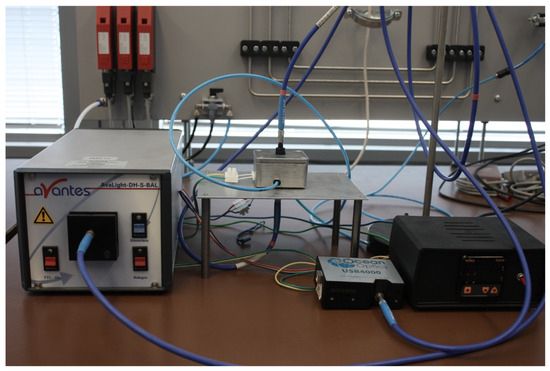 The surface morphology and the elemental distribution were also observed by an FEI XL30 scanning electron microscopy (SEM) with an energy-dispersive X-ray (EDX) analyzer (FEI Company, Hillsboro, Oregon) based on a silicon detector and an S-UTW-Window operating at 30 kV acceleration voltage. The values of optical transmittance were measured in the wavelength range of 250–900 nm using an Ocean Optics spectrometer (Orlando, FL, USA) The dependence of the transmittance of optically transparent nanostructured NiO/Au and TiO2/Au films on hydrogen gas concentration in the range of 100 to 500 ppm was investigated. The experimental setup consisted of a gas flow chamber with an optical window, a light source (AvaLight-DH-S-BAL, Avantes) (Apeldoorn, The Netherlands), a USB4000 fiber optic spectrometer (Ocean Optics), optical fibers, and a computer with spectroscopy software (SpectraSuite 2.0 Ocean Optics) for transmission measurements (Figure 8). The target glass plates with the oxides were placed on a hot plate in the gas flow chamber. Using a temperature controller, the temperature of the hot plate was set to 300 °C and stabilized for 30 min. Then, a mixture of hydrogen and synthetic dry air was allowed to flow through the chamber at a flow rate of 200 mL/min. After the response stabilized (15 min), the optical spectra were acquired in the range of 300 to 900 nm. To evaluate the dependence of transmittance on hydrogen concentration at the point of highest response change, the transmittance values at 350 nm for the NiO/Au and 820 nm for the TiO2/Au were recorded, respectively.