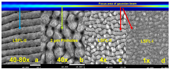 Metamorphosis of LIPSS depending on fluence and number of over-scans. (c,d) Highest fluence in the focal plane and lowest in (a). Sample position indicated by the colored arrows. At an intermediate fluence and 40 overscans pinholes are generated (b). The fluence is related to the sample position indicated by the colored arrows.