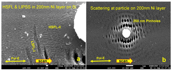 Figure 10 shows such a scattering pattern on a sputtered 200 nm thick Ni layer on Si. The laser power was tuned just below the ablation threshold. The spatial field enhancement by the scattering particle shifted the laser power at some locations above the threshold and caused significant formation of nano-sized pinholes that can grow together and form 2–3 µm pinholes as shown in Figure 9b. In [18], we developed the means to suppress or promote pinhole growth by polarization switching. One can recognize in Figure 10a that two different types of periodic line structures began to evolve in the modulated light field. The LSFL-I type is perpendicular to the polarization of the laser and HSFL-II type is parallel to the polarization in the area with lower light intensity. On a glass substrate, we achieved with the LIPAA process uniform formation of 100 nm HSHL-I structures for sensor research. It shall become our next challenge to generate HSFLs and a sensitive nanoparticle film in situ in the same process. Figure 10b shows an enlarged area in the vicinity of the particle with about 250 nm in diameter pinholes. One can recognize in Figure 10a that two different types of periodic line structures began to evolve in the modulated light field.