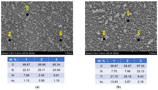 Figure 11 shows SEM images in detail of the target nanostructures for Ni/Au (Ti/Au) sources. The presence of individual elements of the examined samples was determined using EDX analysis. The EDX microanalysis performed during SEM observations on different points revealed that Ni, O, Au and Si are present in the Au/NiO layer in different concentrations (Figure 11a). Also, in the case of Au/TiO2, all elements, Ti, O, Au and Si, were recorded in the layer (Figure 11b). The investigations of the optical parameters allow us to obtain important information such as optical transmittance, absorption coefficient (α) and energy band gap (Eg) of prepared target nanostructured NiO/Au and TiO2/Au films. The values of optical transmittance were measured in the wavelength range of 300–900 nm using an OceanOptics spectrometer (Figure 12). It was found that all investigated nanostructured films are transparent and semiconducting. Using the Tauc method, the band gaps Eg were calculated and they are shown for NiO/Au and TiO2/Au target nanostructures in Figure 12.
