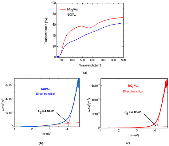 (a) Optical transmittance spectra and optical band gap values determined using the Tauc method for (b) NiO/Au and (c) TiO2/Au target nanostructures.