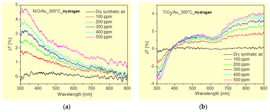 Materials whose optical properties change reversibly by atmospheric gases are known, and these materials have considerable potential for use as optochemical sensors [20,21]. Such sensor elements could have several advantages over classic gas sensors that evaluate electrical parameters. Here, one can include more accurate evaluation as well as better selectivity due to recorded changes in the intensity, wavelength and polarization of the output optical signals. In order to identify the optical properties that can be suitable as a basis of optical answer for the sensor and its sensitivity, their optical transmittance under ambient atmosphere and H2 gas flow from 100 to 500 ppm at an optimal operation temperature of 300 °C were investigated. In Figure 13, the changes in transmittance of the samples show that by the effect of the hydrogen gas, there is a change in the transmittance measured. The adsorbed hydrogen is affecting the transmittance of the prepared nanostructured target NiO/Au and TiO2/Au films, respectively. We can observe small increasing changes in transmittance values with increasing hydrogen concentration in the gas chamber. We recorded a change in transmittance ΔT from 0.7% to 1.6% in the case of hydrogen detection with NiO and from 1.7% to 3.3% in hydrogen detection with TiO2 for the concentration from 100 to 500 ppm. Both of these dependencies are almost linear in the given ranges of hydrogen concentrations. From the given values, it is possible to calculate the sensitivity, which, in the case of NiO, represents a sensitivity value of 0.225%/100 ppm, and for TiO2 represents a sensitivity of 0.4%/100 ppm. We found almost twice the value of hydrogen sensitivity for nanostructured TiO2 compared to NiO. In the presence of reducing gases, including hydrogen, it was observed that thin layers such as NiO, Co3O4 and Mn3O4 show reversible changes in the visible near-IR band [22]. It is the combination of these metal oxides together with Au particles that can improve transmittance sensitivity due to the formation of hydrogen-based species on their surface. In the presence of reducing gases, including hydrogen, it was found that thin metal oxides exhibit reversible changes in optical parameters in the visible–IR band. In addition, the combination of these metal oxides and thin Au layers improves the sensitivity of the optical parameters to reducing gases. The observed changes in the transmittance of our samples show that by the effect of the hydrogen gas, there is a change in the measured transmittance. Recorded changes in the presence of H2 versus dry air in the maximum at 350 nm are caused by dipolar plasmon excitations of the Au/NiO composite film. These increased transmittance values can be correlated with an increase in the density of positive holes in the Au/NiO layer due to the increasing surface area with adsorbed ionized hydrogen particles.