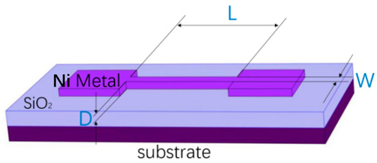The E-fuse protection device was designed as shown in Figure 2. Based on the substrate (Si, as the most common semiconductor, was selected in this paper), a SiO2 dielectric layer with 200 nm thickness is deposited. Above the dielectric, Ni metal was chosen for use as the E-fuse part because of its high strength, corrosion resistance, heat resistance, and good conductivity [15]. The length, width, and thickness of the E-fuse are represented as L, W, and D, respectively. The rectangular parts on the left and right sides of the thin E-fuse are metal electrodes for convenient testing. Obviously, E-fuse devices prepared with pure Ni metal are much simpler and easier to integrate compared to conventional ESD protection devices.