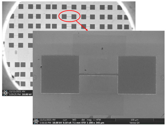 The preparation process follows the order of adhesive coating, electron beam lithography (EBL), development, and metal thermal vapor deposition. First, the photoresist is uniformly spin-coated on the sample surfaces. Next, EBL is performed. The sample is placed in the photolithography equipment and the mask is aligned. After the pattern on the mask has been aligned, the sample is brought into contact with the mask, the photoresist is exposed to UV light, and the sample is immersed in deionized water to remove the conductive adhesive. Development is then performed. The sample is immersed in the developer (4-Methyl-2-pentanone and IPA), and then washed and dried with isopropanol and N2. O2 plasma is used to remove residual rubber backing from the sample surface. Finally, metal thermal evaporation is performed. Metals are deposited using an electron beam metal evaporator. Then, the samples are placed in acetone and sonicated, followed by immersion in a mixture of acetone and IPA to complete the metal stripping. The sample is re-immersed in deionized water and an ultrasonic water bath, and then dried with N2. The image of the prepared device as viewed through a scanning electron microscope (SEM) is shown in Figure 3.