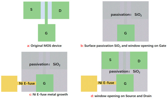 The illustration and diagram of the process and layout of the E-fuse device applied in MOSFET, where G, S, and D denote the gate, source, and drain of the MOSFET, respectively.