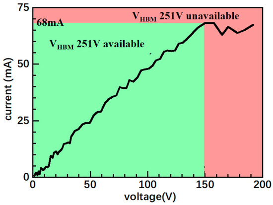 The TLP test was applied on a sample with a Ni E-fuse metal length L of 100 μm, width W of 5 μm, and thickness D of 5 nm to simulate the HBM. The TLP test procedure is shown in Figure 5. By gradually applying increasing voltage pulses to both ends of the device under test (DUT) and recording the voltage across the DUT and the current flowing through it under each pulse, the TLP test curve of the DUT can be obtained. Typically, the rise time of the voltage pulse applied for the TLP test is 10 ns and the pulse width is 100 ns [23,24]. Figure 6 illustrates the TLP test results; when the pulse voltage across the device is less than 149 V and the current is less than 68 mA, the TLP test curve of the device has an approximately constant slope, which is consistent with the normal leakage current characteristics of E-fuse devices. At this stage, the E-fuse resistance Ron can be calculated to be approximately 2191 Ω. When the voltage rises above 149 V and the current exceeds 68 mA, the resistance of the device rises sharply, indicating that the device is damaged by the current generated during the TLP test. During this period, the secondary thermal escape current (It2) can reach as high as 68 mA. Since the E-fuse resistance is significant, the protection voltage calculation equation is expanded so that Equation (1) [25] can be obtained, in which 1500 represents the equivalent resistance of the human body in the HBM. The final protection voltage VHBM of the device was calculated to be 251 V, which is higher than that of similar devices [26,27]. To further enhance the VHBM values, the current density can be reduced by increasing the size of the E-fuse device, which results in a larger It2 and VHBM.