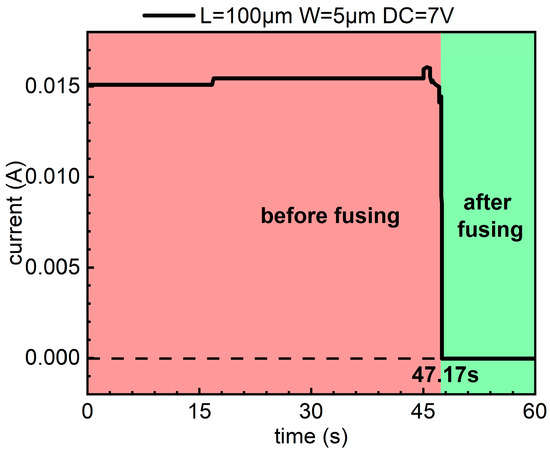 The device with a Ni metal length of 100 μm, a width of 5 μm, and a thickness of 5 nm, which was selected to illustrate ESD test above, presents a fusing performance as shown in Figure 7. It is found that the device is blown under a 7 V voltage in approximately 47.17 s. It is indicated that the devices exhibit low-voltage fusibility. The specific application of the fusing phenomenon is that after the circuit assembly has been completed, the fuse element is blown by an externally applied low DC voltage to finalize the circuit configuration. Disabling or triggering the ESD circuit in this manner will not cause any damage to the protected device. This E-fuse device is a competitive solution for low-cost and reliable on-chip ESD protection requirements.