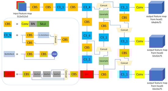 Structure of YOLOv5s. The CBS block consists of a continuous convolution layer, a BN layer, and a SiLU activation. The BottleNeck is a residual structure composed of multiple CBS blocks. The CBSx3_N (C3_N) module contains three CBS blocks, one concat layer, and N BottleNecks.