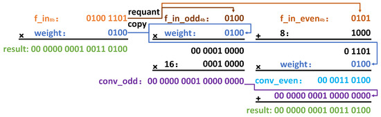 Take an example of convolution between a single channel 1 × 1 input feature-map and a single-channel 1 × 1 filter, as shown in Figure 2. On the left side of the figure, there is a multiplication of an 8-bit input and a 4-bit weight. The 8-bit number is a fixed-point number that has been quantized by SCQ, which is the first step of M4bQ. On the right side of the image, the requantizing and adjusted calculations are displayed. The requantizing converts an 8-bit number into two 4-bit numbers, and , and copies a weight. In other words, the re-quantizing converts the original single-channel input feature-map into two channels 1 × 1 and copies the weight into two channels as well. When performing convolution, multiply directly with a 4-bit weight, then multiply by 16 to obtain , on the other hand, add 8 to first, and then multiply it by a 4-bit weight to obtain . Finally, add them together to obtain the result of adjusted convolution, which is the same as the calculation on the left side of the image.