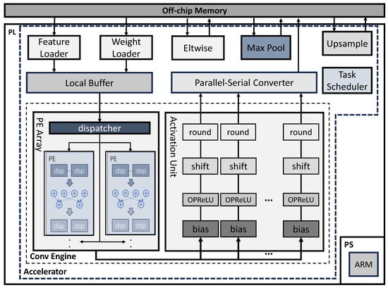 Processing Element (PE) is the basic unit of the PE Array in Figure 3. After receiving data from the Local Buffer, the dispatcher in Figure 3 converts them into multiple vector pairs and sends them to the PEs. Each PE processes 4 vector calculations at the same time. Then, the result of each PE will be sent to the Activation Unit for parallel bias, activation, and quantization, and finally sent back to DDR serially through Parallel–Serial Converter. The internal structure of the PE in the PE Array is shown in Figure 7.