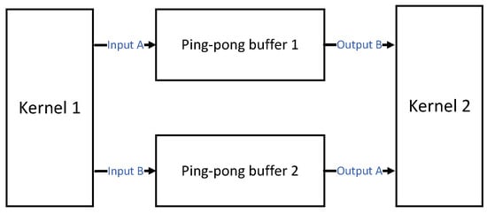 The ping-pong operation is a widely used data flow control technique that can act as a buffer between FPGA kernels, ensuring smooth data flow between upstream and downstream. For example, as shown in Figure 5, the ping-pong operation is used to transfer data between kernel 1 and kernel 2. In stage A, kernel 1 will write data to ping-pong buffer 1, while kernel 2 will read data from ping-pong buffer 2. In stage B, kernel 1 will write data to ping-pong buffer 2, while kernel 2 will read data from ping-pong buffer 1. Alternating between stages A and B completes uninterrupted asynchronous read and write between kernel 1 and kernel 2.