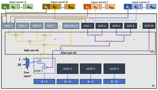 Each PE consists of a number of Input DSPs (IDSP) at the top, a group of Parity Adder Trees (PAT) in the middle, and 4 additional Addition DSPs (ADSP) at the bottom. The IDSPs are configured in the proposed DSP packing mode to support parallel 4-bit multiplications as described in the previous section, that is, each IDSP computes 4 scalar multiplications. For example, IDSP-i takes , , , and as input, and the output is , , , and . The output of each IDSP will be collected by a PAT below. There are a total of 8 PATs, each responsible for computing , , , , , , , . Figure 7 shows two PATs that collect scalar results of from IDSPs with odd numbers and even numbers, respectively, and finally sum them to obtain and . It is proposed to support the parity convolutions as defined by Equation (7), which requires different operations for channels in odd positions and channels in even positions. Then, the results of the PATs are sent to the ADSPs and the calculation of PE is performed.