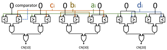 The way to package DSP is as follows: first, assign to the B port and to the A port. Afterward, place the sticker on the left side of the D port and set the remaining bits to 0. Then, add to , and place the result on the left side of port B, which is the . Finally, set the Correction Number (CN). Due to the influence of sign bits of low-position results, high-bit data may be disturbed. For example, the sign bits of may cause a decrease in . Because this result is actually equivalent to , will be affected by the sign bits of . Therefore, a CN is placed in the C port. The bits CN[10], CN[20] and CN[30] are generated by using the circuit shown in Figure 9, while the rest of the bits are set to zeros. This completes the packaging of regular 4-bit multiplication.