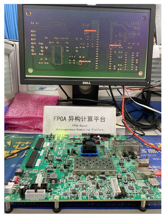 In this paper, YOLOv5s was mapped onto the proposed accelerator to evaluate performance and efficiency. Due to the different performances of industrial inspection equipment in various fields and datasets, in order to fairly evaluate and compare the proposed quantization algorithm, we compared the model accuracy in the VOC dataset with other FPGA accelerators, which is detailed in Section 7.4. Simultaneously, we deployed a PCB defect detection model for industrial applications, which is detailed in Section 7.3. The model quantization training process was conducted on the VOC Dataset(2007 + 2012) and PKU-Market-PCB using PyTorch (version 1.13.1) with a size of 512 × 512. The proposed accelerator was implemented using Xilinx’s HLS flow (version 2022.1) and deployed on the ZCU102 board as shown in Figure 11, which features a Zynq UltraScale+ MPSoC with 4 GB DDR4 memory. The MPSoC device provides 2520 DSP blocks, 32.1 Mb block RAM, and 33,958 CLB resources.