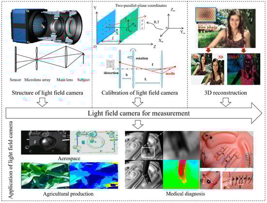 As a new type of optical imaging technology, light field imaging [1,2,3,4,5] is a crucial player in the growing field of photoelectric detection. A light field imaging technology concept was first proposed in 1936 by Alexander Gershun [6]. With computer and digital camera technology developed since the 1990s the 20th century, light field imaging has achieved significant advances with refocusing capability [7,8], multi-view information [9,10,11], depth perception [12,13], compact structure, and fast imaging [14]. Numerous applications have been proposed for light field imaging, ranging from computer vision [15,16] and industrial inspection [17,18,19] to medical imaging [20,21] and autonomous driving [22]. The rise of light field cameras is especially evident in the field of industrial measurement, as shown in Figure 1. Depending on the hardware structures, there are two main types of light field imaging systems: light field cameras and camera arrays [23]. Light field camera uses a microlens array as their core elements and one sensor for capturing both light intensity and direction simultaneously so that they can realize the function of “taking pictures first and then focusing”. As a result, light field cameras can be used in precision inspection fields such as the inspection of workpieces in 3D, the inspection of chips for pins, and the detection of defects in screens of cellphones for delamination [24].