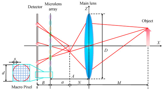 Figure 3 illustrates the structure of a Keplerian-type light field imaging system. (To represent the imaging process, the individual optical elements have been magnified differently in the diagram.) In Figure 3, M represents the distance between the object and the main lens, N represents the distance between the image of the object and the main lens, A represents the distance between the main lens and the microlens array, and B represents the distance between the microlens array and the detector. After determining the object distance M, the Gaussian formula can be used to calculate the image distance N of the target after being imaged by the main lens. Additionally, N can calculate parameters A and B.