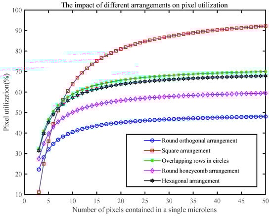 In Figure 5, the round orthogonal arrangement is currently the most common arrangement of microlens arrays used in light field imaging systems. As a result, the image received by the detector after imaging is also tangentially arranged in circles. Due to this, pixels in macropixels will inevitably have areas that do not receive incident light, and these pixels will not be able to record light field information, thereby reducing the effective use of the sensor. Assuming that the diameter of the circular sub-microlens is equivalent to n pixel units, the pixel utilization of the sensor can be calculated by Equation (6). where R = n − 1, the number of pixels corresponding to the macropixel must be an integer, so the method of rounding down is used. By increasing the number of pixels n covered by the sub-microlens, the pixel utilization will increase and reach up to 50% in the round orthogonal arrangement.