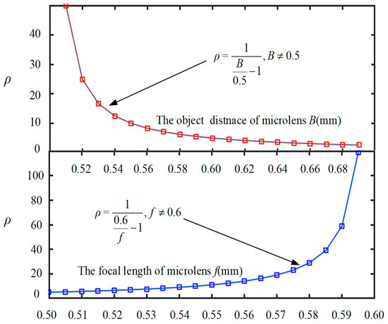 In Equation (11), it can be seen that changing the proportion of parameters B and f extends the depth of field of the light field imaging system. Figure 7 depicts the effect of changing parameters B and f, respectively, on the depth of field of the entire light field imaging system. In a microlens array structure, increasing f or decreasing B can effectively enhance the depth of field. In view of the fact that B is a system parameter and it is closely related to the design of the system structure, it is difficult to change; therefore, it is best to increase f of a single sub-microlens to increase the depth of field. However, in terms of increasing focal length, there are limits to the depth of field that can be achieved.