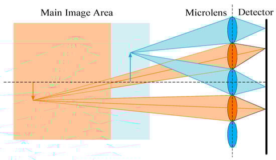 The imaging system designed in this paper is a focused light field imaging system, which overcomes the constraints of spatial resolution and angular resolution in traditional light field imaging systems. As illustrated in Figure 2, an overview of the new type of focused light field imaging system is presented. This system has three main components: a main lens, a novel microlens array, and a detector. A novel microlens array is located between the main lens and the sensor but not in the focal plane. In this design mode, the main lens can be re-imaged to improve the resolution of the imaging system.