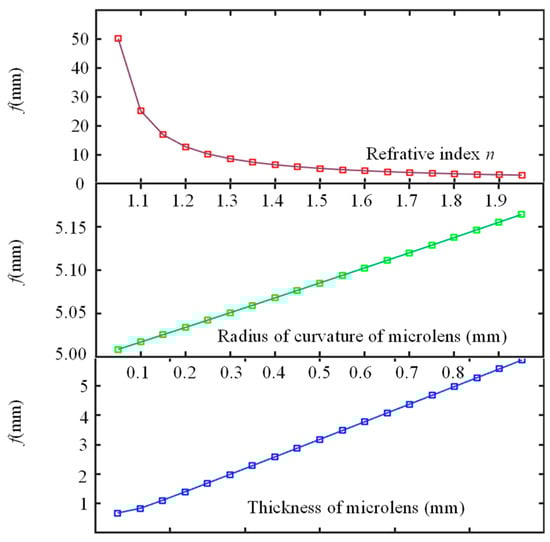 Three parameters determine the focal length of the sub-microlens: the refractive index n, the thickness l, and the radius of curvature R. The relationship between focal length and these three parameters can be seen in Figure 9. According to Figure 9, focal length f follows linearly from thickness l and radius R and quadratically from refractive index n. When changing R to change f, increasing the radius of curvature will increase interference between adjacent units, reducing information transmission; when changing l to change f, due to its thin thickness, sub-microlens cannot be manufactured accurately, resulting in a large error. Therefore, changing n is the most appropriate way to adjust the focal length.