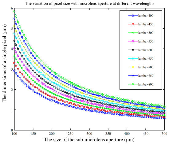 The aperture d of sub-microlens is a very important parameter; the smaller the aperture, the more arrays of microlens there are, and the higher the spatial resolution. Nevertheless, when the aperture of the sub-microlens is small enough, the diffraction phenomenon may affect the imaging. Therefore, the relationship between the aperture and the diffraction phenomenon must be taken into account. During the practical application, the Airy disk is utilized to determine if diffraction influences it. The diffraction phenomenon is not affected when the Airy disk is less than or equal to the size of the image sensor pixel. Light field imaging in this design is performed in the visible light range between 400 nm and 800 nm, with sample intervals of 50 nm. The parameter B is set to 0.6 mm. In Figure 10, you can see how the radius of the Airy disk changes with the aperture of the sub-microlens at different wavelengths of incident light. It can be seen that with the increase in the aperture of the sub-microlens, the radius of the Airy disk decreases. An Airy disk’s radius is positively correlated with the incident wavelength; the longer the incident wavelength, the larger the Airy disk’s radius.