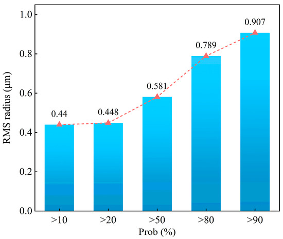Based on sensitivity and Monte Carlo analysis methods, a tolerance analysis was conducted using the RMS radius of the spot diagrams as a measure of system performance in this study. As shown in Figure 12, the tolerance analysis results are displayed as probabilities for changing the RMS radius of the spot diagrams of the double-sided even aspheric surface. The results indicate that more than 90% of the samples had an RMS radius of less than 0.907 μm, much smaller than the radius of the Airy spot (3.53 μm). There is no problem with the tolerance range as it meets the RMS radius requirements of the spot diagrams for the double-sided even aspheric surface.