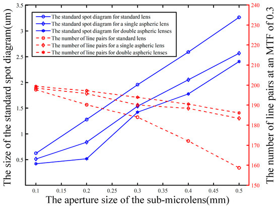 An imaging result of one sub-microlens from a Zemax simulation is shown in Figure 11. According to the results, the light cannot completely focus on the focal point when the ordinary spherical mirror is imaging, which will result in some divergence in the final imaging. Nevertheless, it is effective in solving this problem and improving imaging quality with the use of an aspheric structure, whether it is a single-sided aspheric or a double-sided aspheric structure. For d = 100 μm, the RMS radius of a standard spherical surface is 0.627 μm, that of a single-sided even aspheric surface is 0.516 μm, and that of a double-sided even aspheric surface is 0.423 μm. Considering the spot diagrams results, the aspheric surface type has a certain improvement on the imaging quality of the microlens, whereas the double-sided even aspheric effect is superior. When the center wavelength is 550 nm, and the MTF value is greater than 0.3, the eigenfrequency of the standard spherical surface reaches 197.7 lp/mm. The eigenfrequency of single-sided even aspheric surface reaches 198.5 lp/mm. The eigenfrequency of the double-sided even aspheric surface can reach 199.4 lp/mm. Consequently, double-sided even-time aspheric imaging has the best image quality, single-sided even-time aspheric image quality is second, and standard spherical mirror image quality is poor. Combined with the analysis results of the spot diagrams, the double-sided even aspheric structure is selected as the surface shape of the sub-microlens.