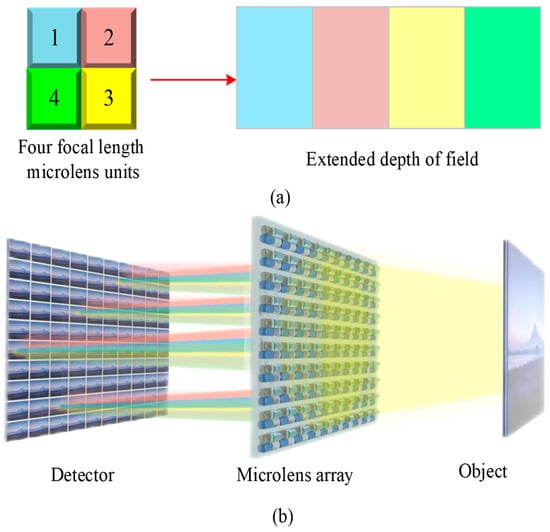 To improve the depth of the system’s field, a multifocal microlens array structure has been developed. The focal lengths of sub-microlens must be set differently in the microlens array so that the depth-of-field boundaries of adjacent lenses can be tied together. With this design, the depth of field of the system is the sum of the depth of field of multiple sub-microlens with different focal lengths, greatly increasing the depth-of-field range. As shown in Figure 8, a microlens array for secondary imaging is composed of two sub-microlens with staggered focal lengths. Secondary images of close targets were acquired using short focal length microlens, while distant targets were acquired using long focal length microlens. The designed focal length value allows the short focal length and long focal length microlens to be connected in the clear imaging range, extending the depth-of-field range.