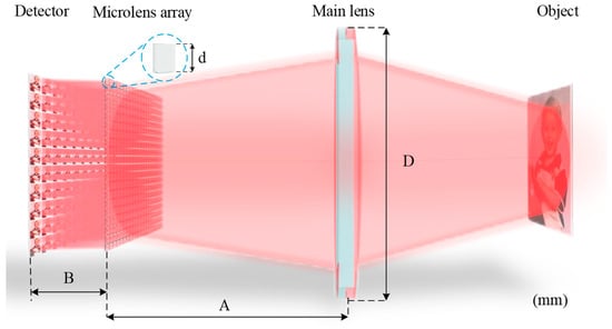 In Equations (1)–(3), a represents the object distance of the secondary imaging of the microlens array; d denotes the aperture of the sub-lens; f denotes the focal length of the sub-lens; and D indicates the aperture of the main lens. The simultaneous Equations (1)–(3) can be used to calculate A and B in the following way: