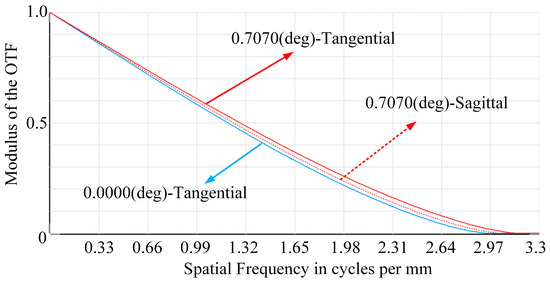 To further assess the imaging quality of the light field imaging system, the MTF curve was used to evaluate imaging quality. Figure 17 shows the MTF curve for the sub-microlens in three visible fields of view. When a single sub-microlens’ MTF value is greater than 0.3, its eigenfrequency can reach more than 1.7 lp/mm, indicating high image quality.