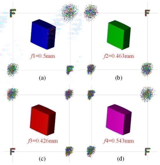 Additionally, the non-sequential mode of Zemax was employed to construct a novel light field imaging system with a four-focal-length square microlens array, and its imaging effect was assessed. As described in Section 3.2, four sub-microlens with different focal lengths are designed, and the imaging results after simulation are shown in Figure 18.
