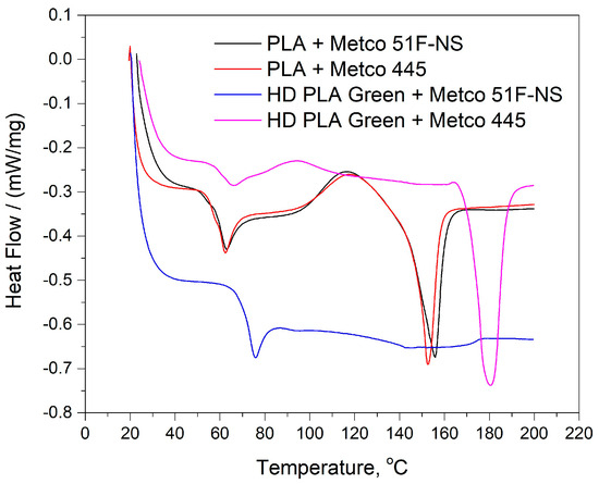For the PLA substrate, the black and red curves reflect similar behaviors. The first transformation of PLA + Metco 51F-NS (black curve), on the initial part of the curve, was highlighted as an endothermic slope, associated with Tg (glass transition) at temperature 60.4 °C, and with a specific heat (required for the transformation) of 0. 320 J/(g*K).