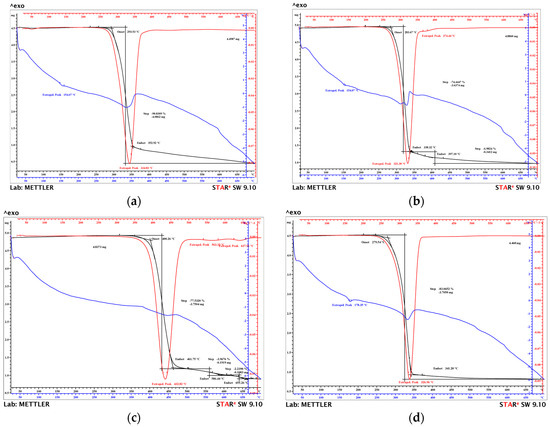 The Mettler Toledo TGA/SDTA 851 (Columbus, OH, USA) equipment was used to calculate thermogravimetric curves (TG), derived thermogravimetric curves (DTG), and differential thermal analyses (DTA). The mass of the samples that were thermally decomposed was approximately 4.46 to 4.88 mg. It was operated at a flow rate of 20 cm3/min in air atmosphere. The study was performed at 25–700 °C with a heating rate of 10 °C/min. STARe SW 9.10 software produced by Mettler Toledo (Columbus, OH, USA) was used to process the thermogravimetric curves. The start (Tonset), peak (Tpeak), and end (Tend) temperatures of each thermal degradation phase were measured. In addition, the percentages of mass loss or residue (W%) were indicated.