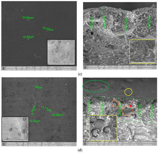 SEM cross-sectional analysis of samples coated with copper-based composite powder: (a) PLA + Metco 51F-NS, (b) PLA + Metco 445, (c) HD PLA Green + Metco 51F-NS, (d) HD PLA Green + Metco 445.