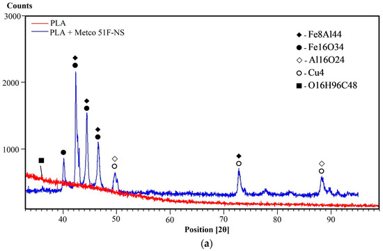 The diffractograms for the samples coated with the composite bronze powder, Metco 51F-NS, reflect a crystalline structure, emphasized by specific tall and thin peaks. The PLA + Metco 51F-NS sample (blue diffractogram—Figure 4a) shows a series of major peaks of different intensities, as follows: Fe8Al44 at angles of 42.358°, 44.400°, 46.816°, and 72.882° [72]; Fe16O34 at 2θ angles of 40.251°, 42.312°, 44.364°, and 46.878° [73]; Al16O24 (aluminum oxide—kappa) at angles of 40. 251°, 42.396°, 42.396°, 44.399°, and 47.485°, of lower intensity [74]; and Cu4: 50.419°, 74.078°, 89.874°, of lower intensity [75].