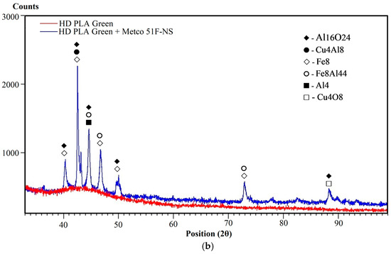 - The PLA substrate sample (Figure 5a) showed an intense peak at 2θ for the angle of 45.199° (Fe4) and 44.740° (Al4) [78]. Two other lower intensity peaks were associated with the presence of Cu4 at 74.926° [80], and Fe4 at 51.575° [78]. The lower intensity peaks from all these identified elements are part of the composition of the copper-based powder deposited on the substrate. The polymeric substrate as in the previous samples revealed the presence of the compound O16H96C48 [71], which was previously reported.