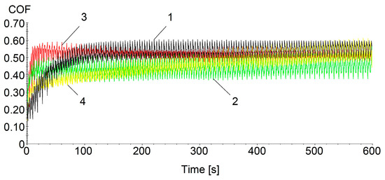 COF variation with test time for coated PLA and HD PLA Green, 1–4 the tested samples.