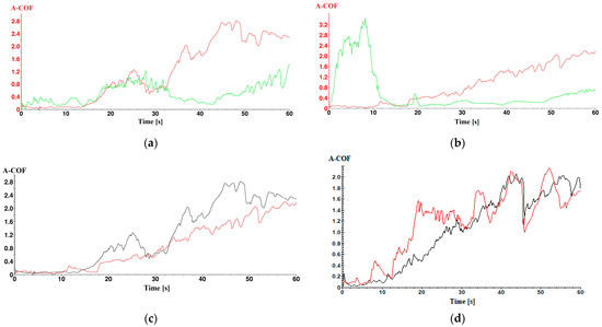 Variation in apparent A-COF with test time for samples coated with copper-based metal micropowder: (a) PLA substrate, coated with Metco 51F-NS—red curve; Metco 445—green curve. (b) HD PLA Green substrate, coated with Metco 51F-NS—red curve; Metco 445—green curve. (c) Metco 51F-NS coating: substrate PLA—black curve; substrate HD PLA Green—red curve. (d) Metco 445 coating: substrate PLA—black curve; substrate HD PLA Green—red curve.