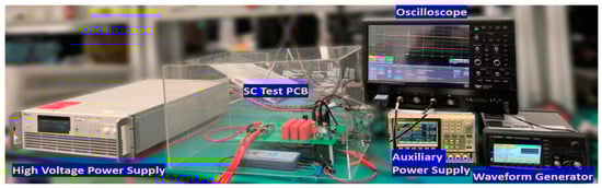 A photograph of the short-circuit characterization test setup is shown. It features the high-voltage power supply, which charges the bus capacitor on the Printed Circuit Board (PCB) and ensures a stable DC bus voltage for the tests. The gate trigger signal, crucial for switching the SiC MOSFETs on and off, is provided by the waveform generator. Simultaneously, the oscilloscope captures key measurements, including the drain-source voltage (VDS), drain current (IDS), and gate-source voltage (VGS) of the SiC MOSFETs during short-circuit testing.